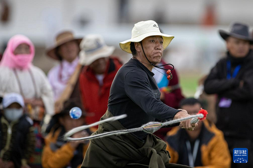 9月6日,在那曲市恰青賽馬節(jié)現(xiàn)場(chǎng),一名選手們參加烏爾朵比賽。(新華社記者 姜帆 攝)