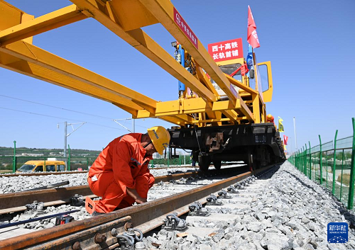 9月8日,施工人員在西十高鐵西安東至藍(lán)田區(qū)間鋪設(shè)無縫鋼軌。(新華社記者 李一博 攝)