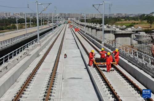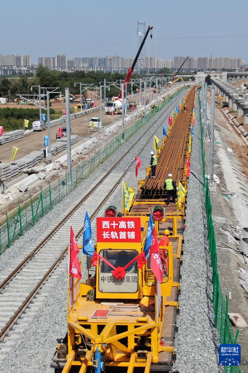 9月8日,在西十高鐵建設(shè)現(xiàn)場(chǎng)西安東至藍(lán)田作業(yè)區(qū)間,施工人員將首對(duì)500米長(zhǎng)的無縫鋼軌平穩(wěn)鋪設(shè)在無砟軌道板上,標(biāo)志著由西成客專陜西公司建設(shè)、中鐵四局施工的西十高鐵全線鋪軌正式啟動(dòng)。