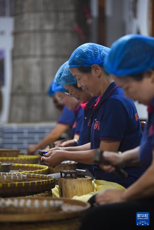 9月9日,在臨安龍崗鎮(zhèn)一家山核桃生產(chǎn)企業(yè),工作人員通過手敲山核桃取整仁。(新華社記者 翁忻旸 攝)