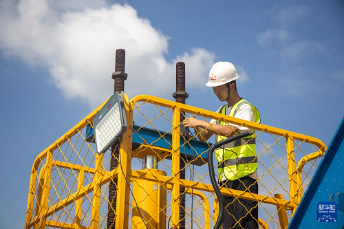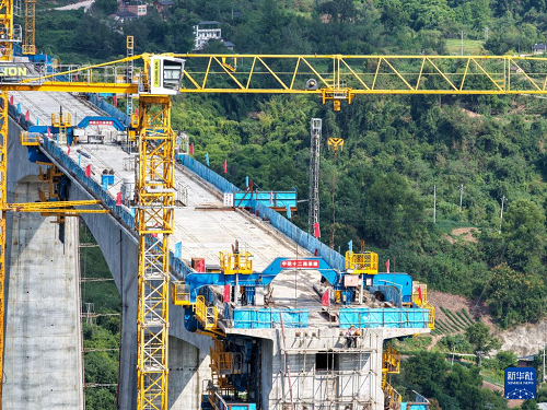 9月24日,工人在渝萬(wàn)高鐵五步河雙線特大橋建設(shè)現(xiàn)場(chǎng)施工作業(yè)。(新華社記者 唐奕 攝)