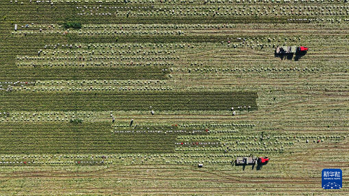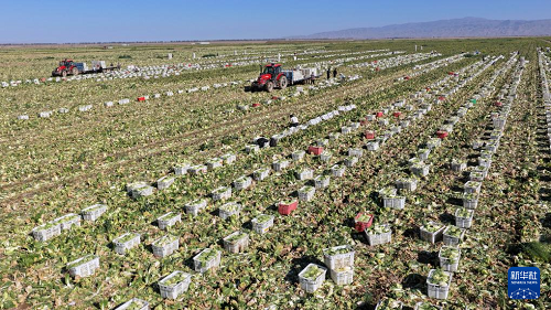 9月23日,菜農(nóng)在甘肅山丹馬場(chǎng)蔬菜基地里收獲蔬菜(無(wú)人機(jī)照片)。(新華社發(fā) 王超 攝)
