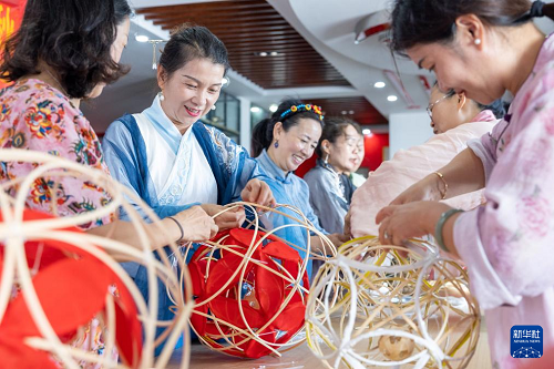 9月28日,在浙江省溫嶺市橫峰街道馬鞍橋村文化禮堂,居民們制作“滾燈”。(新華社發(fā) 徐偉杰 攝)
