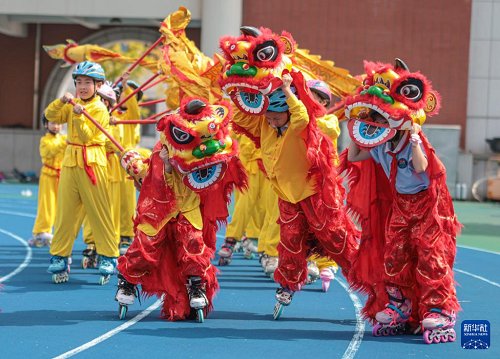 9月29日,在山東省榮成市實(shí)驗(yàn)小學(xué),孩子們表演舞龍舞獅。(新華社發(fā) 李信君 攝)