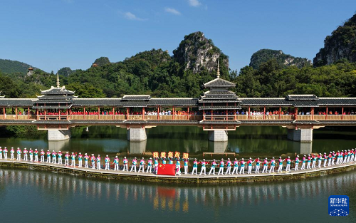 9月28日,在廣西柳州市龍?zhí)豆珗@,人們共同唱響《我和我的祖國(guó)》(無(wú)人機(jī)照片)。(新華社發(fā) 黎寒池 攝)