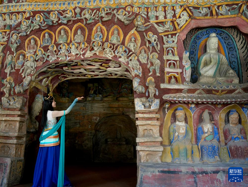 10月9日,在位于今潮8弄的戶外展區(qū),參觀者游覽云岡第12窟“音樂(lè)窟”的1:1復(fù)制洞窟。(新華社記者 劉穎 攝)