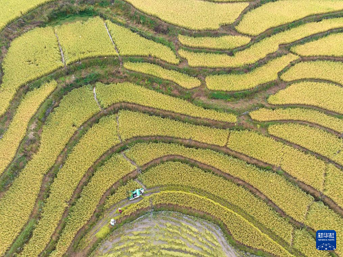 10月10日,湖北省宜昌市秭歸縣沙鎮(zhèn)溪鎮(zhèn)長春村村民駕駛農(nóng)機在田間收獲水稻(無人機照片)。(新華社發(fā) 雷勇 攝)