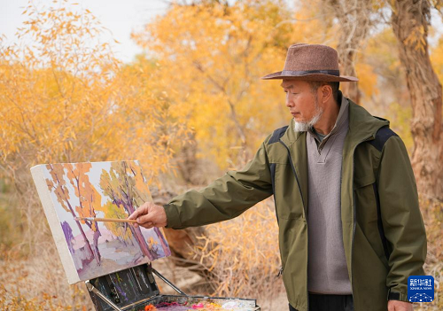 10月13日,繪畫愛好者在新疆巴音郭楞蒙古自治州尉犁縣一處胡楊林中寫生。(新華社發(fā) 汪志鵬 攝)