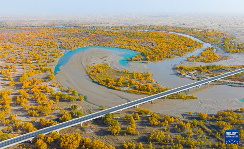 金秋時節(jié),新疆巴音郭楞蒙古自治州尉犁縣境內(nèi)的沙漠胡楊景觀與塔里木河互相映襯,美不勝收,吸引不少游客觀光游覽。