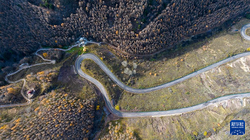 10月26日在位于寧夏固原市隆德縣的寧夏六盤山紅軍長征景區(qū)拍攝的秋景(無人機(jī)照片)。(新華社記者 王鵬 攝)