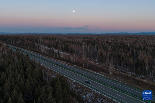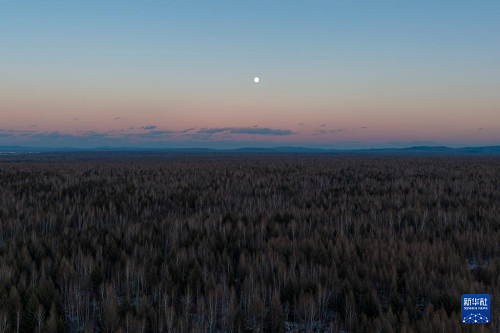 這是11月4日拍攝的黑龍江省伊春市豐林縣上空的月亮(無人機照片)。(新華社記者 謝劍飛 攝)