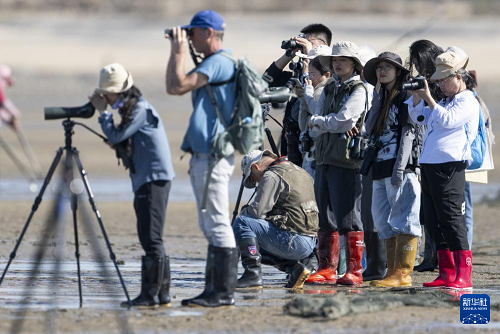 11月9日,中外觀鳥愛好者在泉州圍頭灣灘涂上觀測勺嘴鷸。(新華社記者 魏培全 攝)