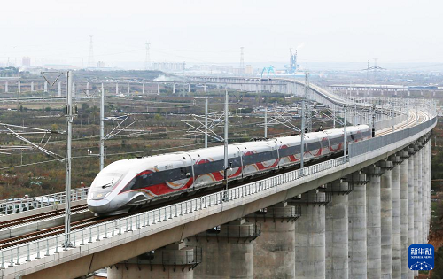 11月17日,一列試驗動車組通過西延高鐵渭河特大橋(無人機照片)。(新華社記者 張博文 攝)