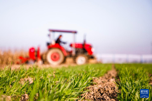 11月19日,在河南省商丘市睢縣鳳城街道劉樓村,農(nóng)機(jī)手駕駛播種機(jī)播種冬小麥。(新華社發(fā) 徐澤源 攝)