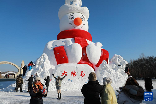 12月9日,第38屆太陽島雪博會標志性雪塑景觀“雪人先生”在哈爾濱太陽島風景區(qū)正式亮相?!把┤讼壬备?3.8米,用雪量達5000立方米。