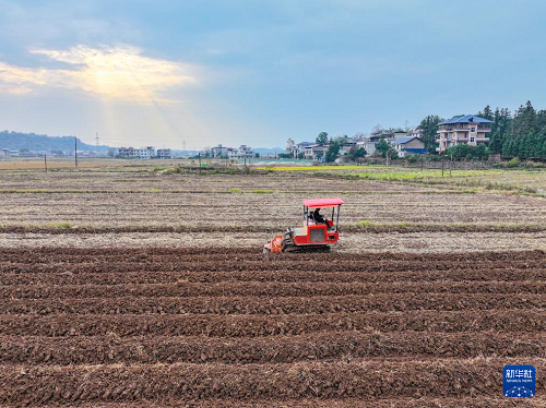 12月17日,湖南省常寧市洋泉鎮(zhèn)農(nóng)民駕駛農(nóng)機(jī)在翻耕農(nóng)田(無人機(jī)照片)。(新華社發(fā) 周秀魚春 攝)