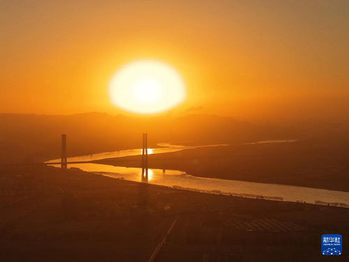12月23日在日出時分拍攝的包銀高鐵烏海黃河特大橋。(新華社記者 邢廣利 攝)