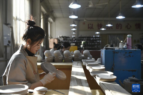 12月25日,工作人員在河北省曲陽(yáng)縣一家定瓷生產(chǎn)企業(yè)的車(chē)間里加工定瓷產(chǎn)品。(新華社記者 魯鵬 攝)