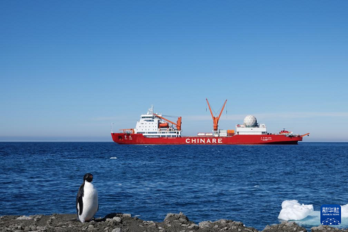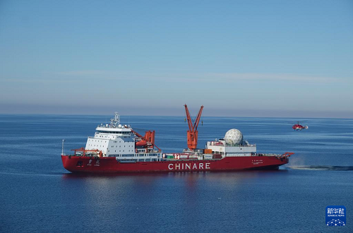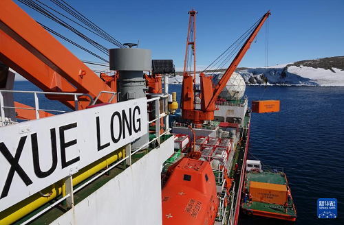 12月29日在秦嶺站海域拍攝的“雪龍”號極地科考破冰船。(新華社記者 顧天成 攝)