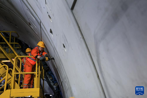 1月6日,中鐵十四局施工人員在“深江1號”盾構機上進行管片螺栓緊固工作。(新華社記者 毛思倩 攝)