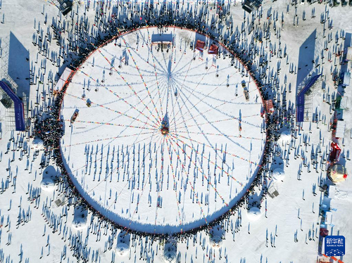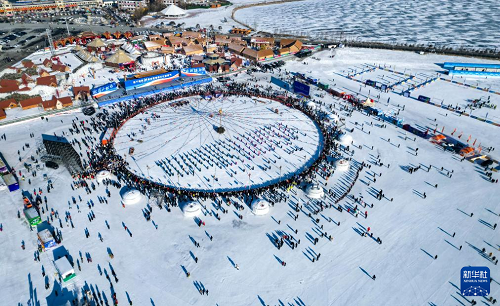 1月8日,在吉林省松原市,人們參加吉林·查干湖第24屆冰雪漁獵文化旅游節(jié)開幕式(無人機照片)。(新華社記者 顏麟蘊 攝)
