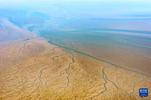 1月15日,養(yǎng)殖戶駕駛拖拉機(jī)趁著退潮出海采收紫菜(無人機(jī)照片)。(新華社發(fā) 許叢軍 攝)