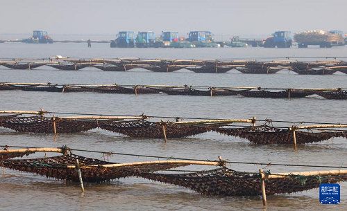 1月15日,養(yǎng)殖戶駕駛拖拉機(jī)趁著退潮出海采收紫菜(無人機(jī)照片)。(新華社發(fā) 徐書影 攝)