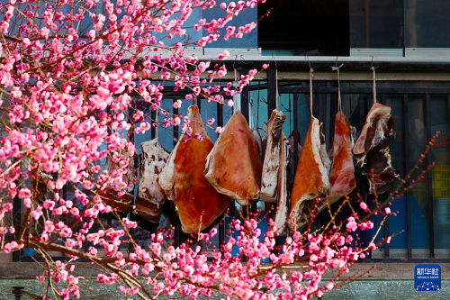 1月13日拍攝的梅花掩映著重慶市黔江區(qū)伴山國(guó)際小區(qū)居民窗口的過(guò)年臘肉。(新華社發(fā) 楊敏 攝)