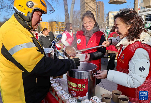 1月25日,河北省秦皇島市海港區(qū)海濱路街道開(kāi)灤路社區(qū)開(kāi)展“飄香臘八粥 溫馨暖人心”活動(dòng)。這是志愿者為網(wǎng)約配送員盛臘八粥。(新華社發(fā) 曹建雄 攝)