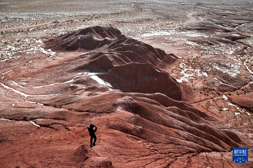 1月29日,游客在內(nèi)蒙古烏蘭察布市四子王旗紅崖臺(tái)地拍照游玩。(新華社記者 貝赫 攝)