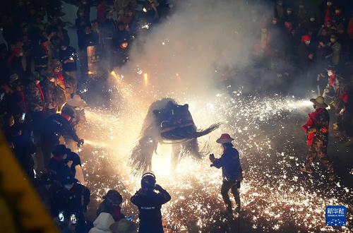 “蜀河燒獅子”于每年農(nóng)歷正月十三至十六舉行。夜幕降臨后,舞獅隊(duì)伍會走街串巷,在家家戶戶門前停留,通過舞獅來傳遞祝福。在此過程中,表演人員和圍觀群眾會點(diǎn)燃特制的煙花,朝“獅子”噴射火花。根據(jù)當(dāng)?shù)亓?xí)俗,“燒獅子”象征迎來好運(yùn)與吉祥,火花越猛,新年的運(yùn)勢越興旺。