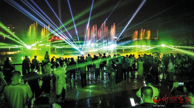 公園在注重園林、景觀建設(shè)的同時(shí),突出主題文化內(nèi)涵的展現(xiàn),湖水噴泉、觀賞果園、主題植物園、階梯花臺(tái)等特色園林具有觀賞性,園內(nèi)還配套建有遺山文化館、張拉膜廣場(chǎng)、健舞劇場(chǎng)、休閑茶吧、咖啡館等群眾休閑活動(dòng)場(chǎng)所,是又一惠及民生的心靈家園。圖為8月1日晚,市民在遺山公園噴泉廣場(chǎng)觀賞絢麗多彩的噴泉燈光秀。劉紀(jì)森 智芝龍 白曉明 胡 煒 攝