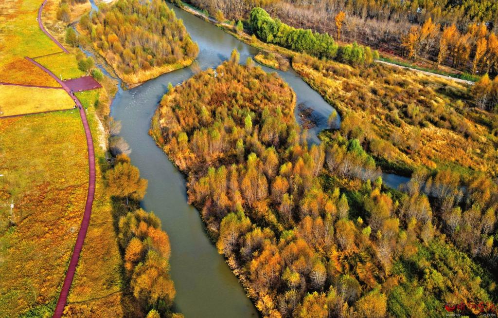 圖為濕地公園內(nèi),汾河河道蜿蜒曲折,水面清澈明凈,景致秀麗。