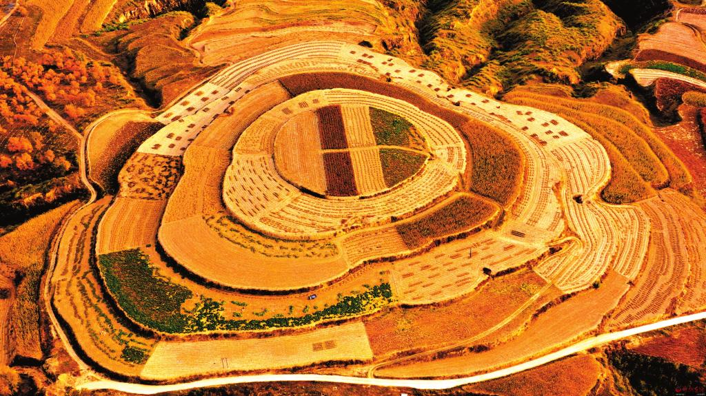 層層梯田滿目金黃,極目遠(yuǎn)眺宛如畫卷。河曲縣鄉(xiāng)村錯落有致的梯田與曲折的道路相呼應(yīng),繪出一幅別致的田園風(fēng)光畫。(何 帥 楊成林?jǐn)z)