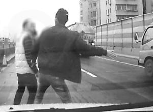 在郭先生轎車的行車記錄儀的錄像中,郭先生拿著手機站在車頭,另外兩名男子也跟了上來,雙方隨后發(fā)生言語沖突,其中一名身穿黑色外套的男子更是動手拍打郭先生的臉部,隨后,郭先生還被黑衣男子推打。