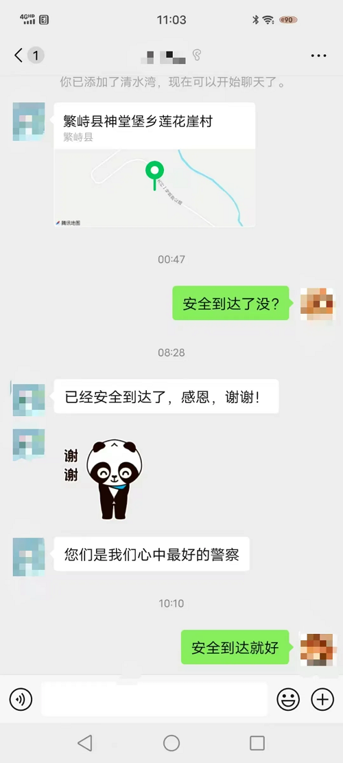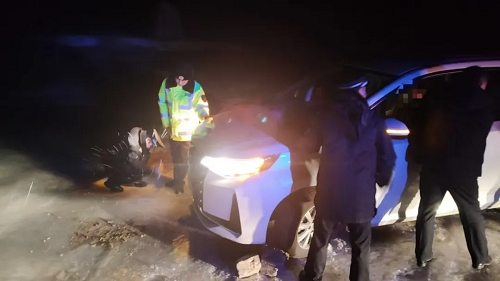 接到報警后,神堂堡派出所民警迅速通過電話聯(lián)系報警人,得知車上共有七人,多為婦女兒童,民警首先安撫游客情緒,并在確定具體地點后,立即與神堂堡交警中隊民警驅(qū)車趕往事發(fā)地。到達(dá)現(xiàn)場后,民警了解到,報警人張某與家人朋友自駕前往五臺山旅游,開到蓮花崖大峽谷山區(qū)路段時由于路面有冰導(dǎo)致車輛打滑沖出路面,車輛正被困在一處斜坡處,距離前面的深溝只有一米左右,進(jìn)退兩難,無法動彈。此時,車上幾名游客已凍得瑟瑟發(fā)抖,情況不容樂觀。民警們第一時間制定救援措施,他們不畏嚴(yán)寒、相互配合,經(jīng)過長時間的努力,終于將被困車輛從冰面推到了無冰路段。車輛脫困,游客對民警們的及時救援表示了由衷的感謝,緊緊握住民警的手,激動地說:“非常感謝警察同志的幫助,您們是我們心中最好的警察!”