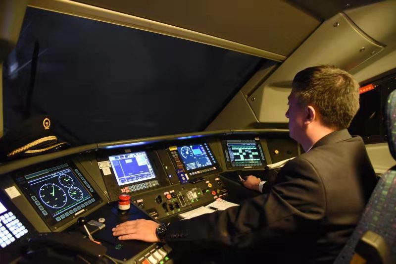 當(dāng)D6770次列車到達呼和浩特東站,弓國慶登上機車,與換班司機交接完畢后,插入IC卡,認真核對行車數(shù)據(jù)、確認操縱臺各儀表……各項安全準(zhǔn)備工作無誤后,隨著機車前方發(fā)車信號變?yōu)榫G燈,與車站進行車機聯(lián)控確認,隨著一聲汽笛長鳴,動車組緩緩駛出呼和浩特東站?!皬氐撞t望,確認信號,高聲呼喚,手比眼看”的標(biāo)準(zhǔn)化作業(yè)與每三十秒腳踩提醒踏板的一系列操作流暢默契……盡管這種周而復(fù)始的工作他已重復(fù)了成千上萬遍,但從不敢松懈。