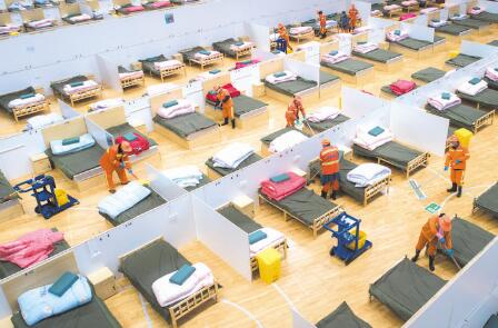 2月12日,在武漢體育中心方艙醫(yī)院,工人在進(jìn)行整理和清潔工作。