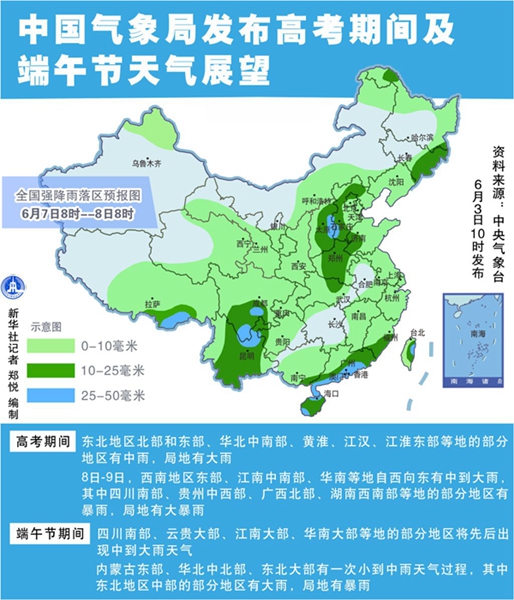 記者3日從中國氣象局6月新聞發(fā)布會上了解到,高考期間,東北地區(qū)北部和東部、華北中南部、黃淮、江漢、江淮東部等地的部分地區(qū)有中雨,局地有大雨;8日至9日,西南地區(qū)東部、江南中南部、華南等地自西向東有中到大雨,其中四川南部、貴州中西部、廣西北部、湖南西南部等地的部分地區(qū)有暴雨,局地有大暴雨。上述部分地區(qū)還將伴有短時強降水、雷暴大風等強對流天氣,需要做好相應(yīng)防范。