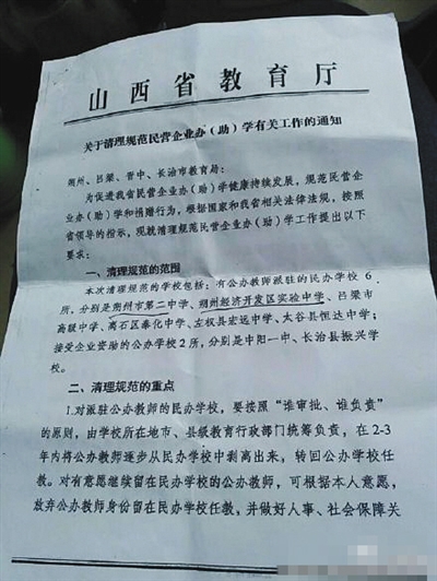 新京報(bào)記者看到,文件名為《關(guān)于清理規(guī)范民營(yíng)企業(yè)辦(助)學(xué)有關(guān)工作的通知》,加蓋有山西省教育廳公章。文件中明確提出,“在2-3年內(nèi)將公辦教師逐步從民辦學(xué)校中剝離岀來(lái),轉(zhuǎn)回公辦學(xué)校任職?!?/p>