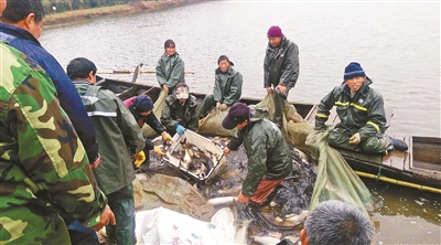 武漢科技大學(xué)聘請(qǐng)的專業(yè)捕撈隊(duì)將漁網(wǎng)收到岸邊