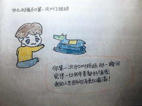 懷孕難產(chǎn)的疼痛;早產(chǎn)的孩子住保溫箱;孩子第一次叫媽媽;孩子第一次去幼兒園的分離……各種珍貴而有紀(jì)念意義的場面,都被媽媽用漫畫配著文字記錄下來。