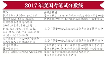 今年的分?jǐn)?shù)線與往年基本保持持平,報(bào)考省級(jí)以上(含副省級(jí))職位的合格分?jǐn)?shù)線為:總分不低于105分,且行政職業(yè)能力測(cè)驗(yàn)不低于60分;報(bào)考市(地)、縣(區(qū))級(jí)職位的合格分?jǐn)?shù)線為:總分不低于95分,且行政職業(yè)能力測(cè)驗(yàn)不低于50分。