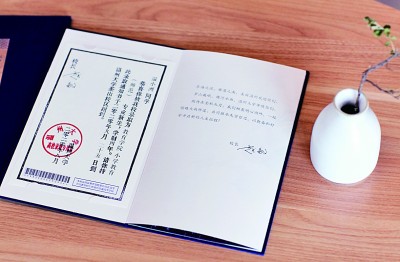 在溫州大學(xué)本科招生錄取現(xiàn)場(chǎng),一本本藍(lán)色燙金的錄取通知書正整整齊齊地?cái)[放在會(huì)議桌上,整裝待發(fā)。通知書整體采用中國(guó)傳統(tǒng)文書褶子樣式,封面是燙金的“錄取通知書”和學(xué)校?;?,封底是王蒙題詞的校訓(xùn)“求學(xué)問是,敢為人先”。展開五折折頁(yè),正面分別是瑞安市東源村木活字傳承人親手印刷的錄取證書頁(yè)、校長(zhǎng)寄語(yǔ)、校歌,背面則是以溫州地理標(biāo)志大羅山為底、溫大建筑為前景的山水畫卷。