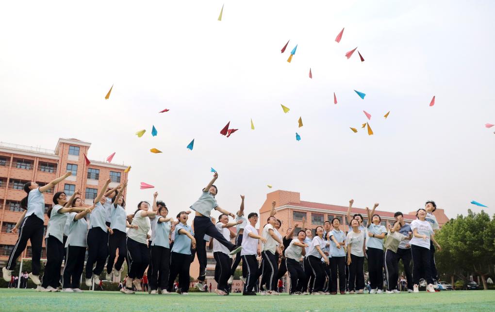 5月22日,在山東省高密市第五中學(xué),高三學(xué)生將寫有夢想的紙飛機(jī)拋向空中。高考臨近,各地學(xué)校組織高三學(xué)生開展不同形式的減壓活動(dòng),幫助學(xué)生放松心情,迎接高考。新華社發(fā)(李海濤攝)