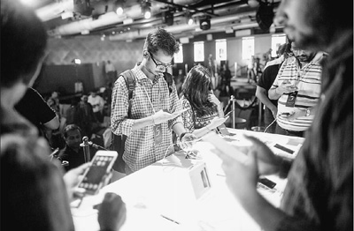 3月31日,小米5手機(jī)在印度新德里正式發(fā)布。圖為顧客在發(fā)布會(huì)現(xiàn)場(chǎng)體驗(yàn)新款手機(jī)。