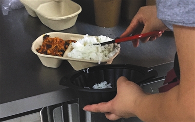 到下午三點(diǎn)多,這些成品菜會(huì)從加熱機(jī)中撈起,如果有人訂餐,就再放進(jìn)微波爐里加熱。賣不完的成品菜,晚上放入冷藏柜里,等第二天循環(huán)加熱,直到下一位顧客買走它。