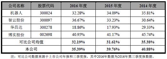 2014年至2016年,同行業(yè)上市公司綜合毛利率均值分別為35.38%、31.61%、32.19%??藖頇C電綜合毛利率高于可比公司均值。
