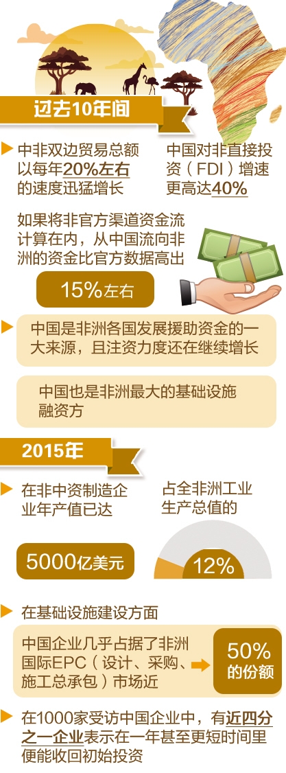 從經(jīng)營領(lǐng)域上看,調(diào)查顯示,中國企業(yè)在非洲的經(jīng)營領(lǐng)域十分廣泛,除制造業(yè)外,服務(wù)業(yè)企業(yè)占比達(dá)四分之一,貿(mào)易企業(yè)與建筑及房地產(chǎn)企業(yè)占比各為五分之一。2015年,在非中資制造企業(yè)年產(chǎn)值已達(dá)5000億美元,占全非洲工業(yè)生產(chǎn)總值的12%。在基礎(chǔ)設(shè)施建設(shè)方面,中國企業(yè)的主導(dǎo)地位更為明顯——幾乎占據(jù)了非洲國際EPC(設(shè)計(jì)、采購、施工總承包)市場近50%的份額。中國企業(yè)的盈利也相當(dāng)可觀,在1000家受訪企業(yè)中,有近四分之一企業(yè)表示在一年甚至更短時(shí)間里便能收回初始投資,三分之一的企業(yè)利潤率超過20%。而且,這些企業(yè)的市場觸覺極其敏銳,能夠迅速適應(yīng)新環(huán)境、響應(yīng)新機(jī)遇。這些企業(yè)主要側(cè)重滿足非洲日益增長的市場需求,而非出口業(yè)務(wù)。許多中國企業(yè)已在非洲開展了長期投資,有74%的受訪中資企業(yè)對未來發(fā)展前景抱有樂觀態(tài)度。