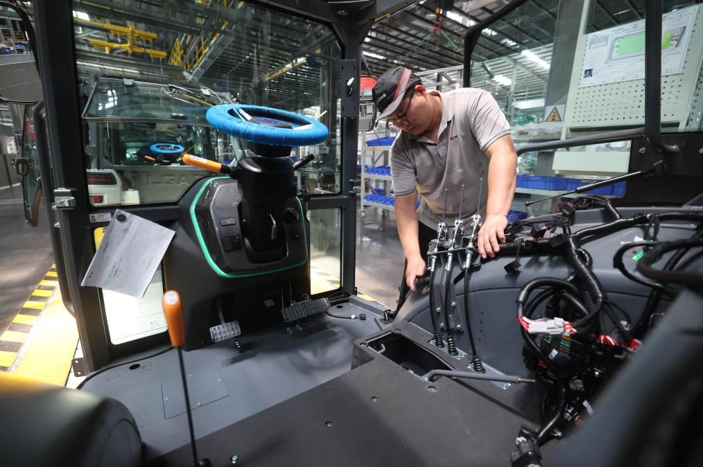 7月27日,工人在山東省臨沂市蘭山區(qū)臨工智慧農(nóng)機裝備產(chǎn)業(yè)園的流水線上組裝拖拉機。新華社發(fā)(王彥冰攝)??
